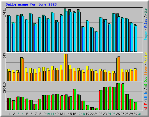 | Day | Hits | Files | Pages | Visits | Sites | kB F | kB In | kB Out | ||||||||